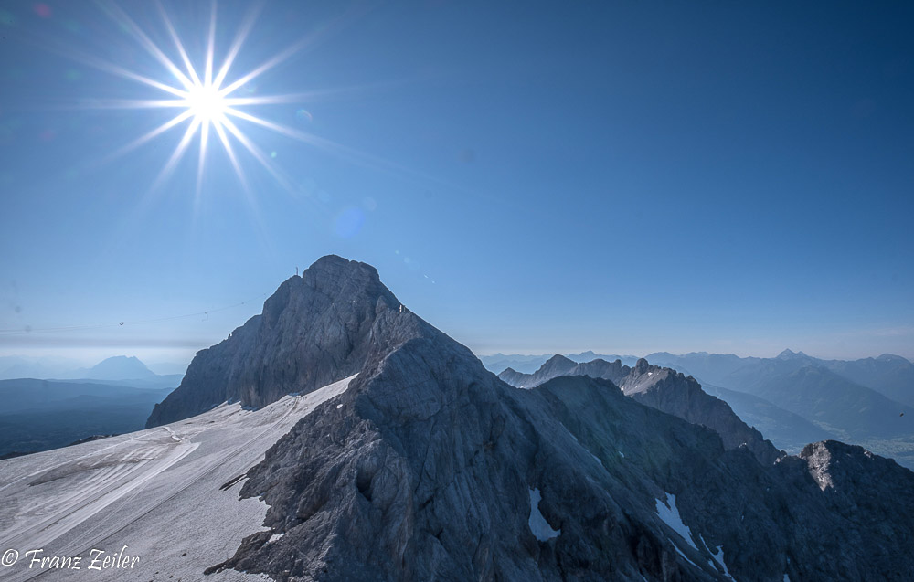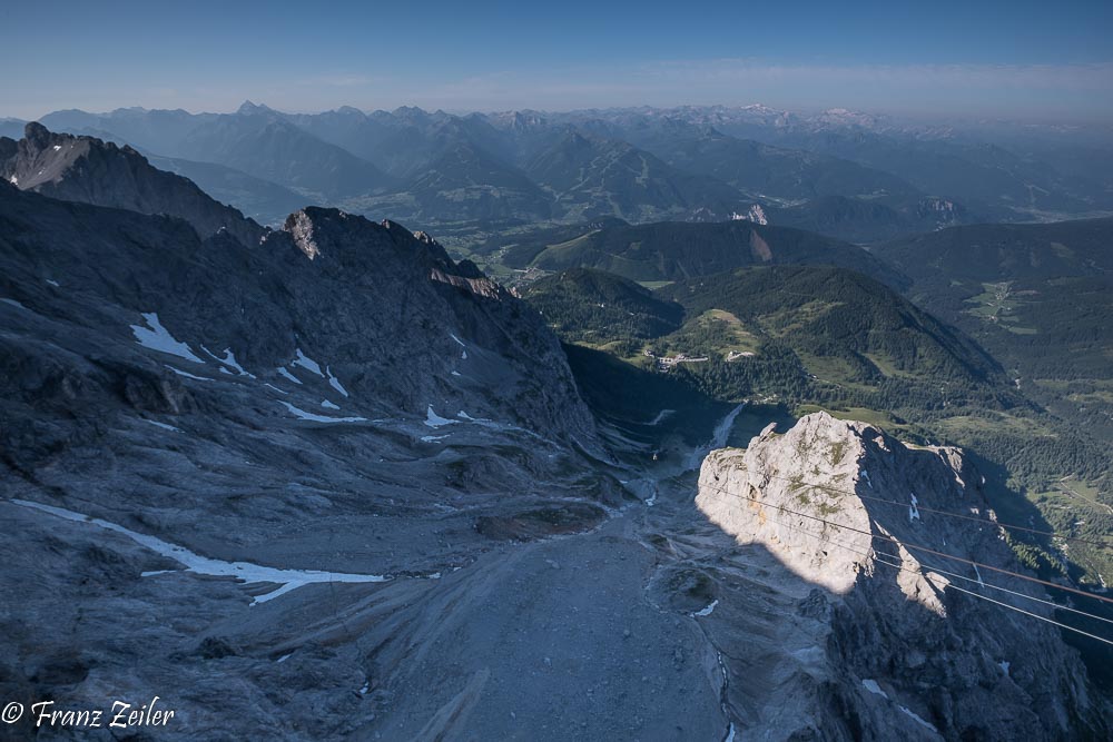 Ich begebe mich nochmals auf die Aussichtsplattform, fotografiere die Südabstürze in der Mittagssonne bei geänderten Lichtverhältnissen und nehme anschließend die nächste Gondel-Talfahrt:
