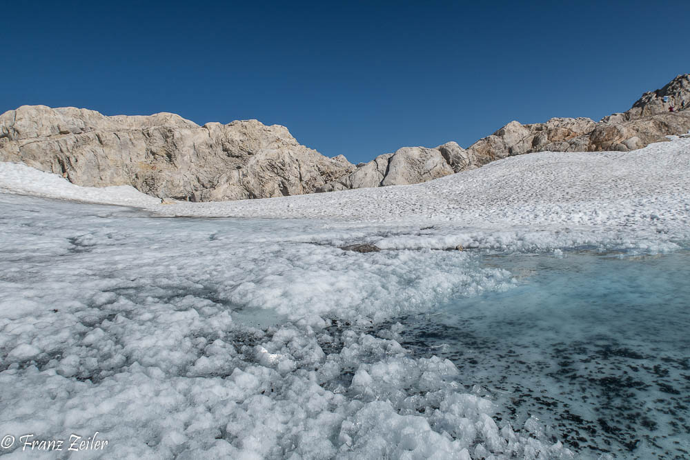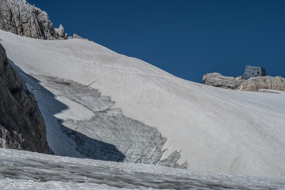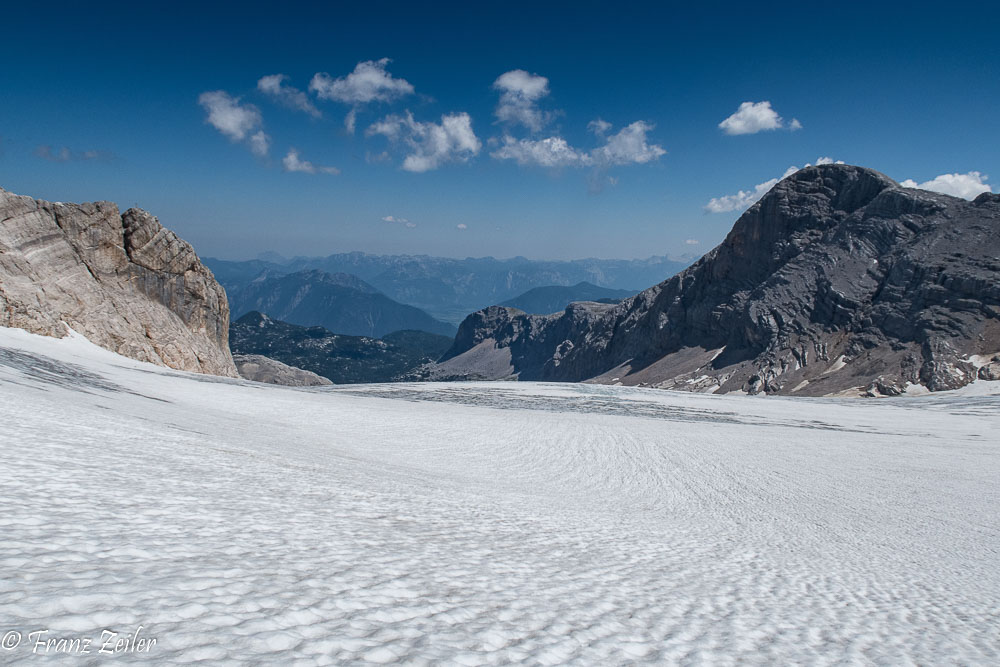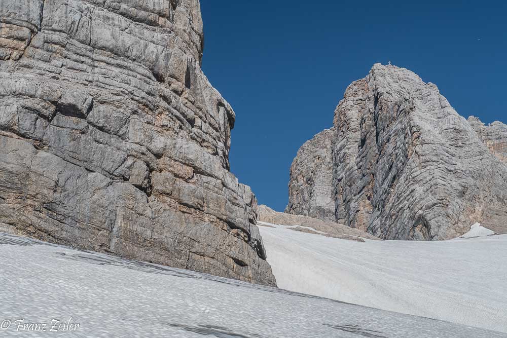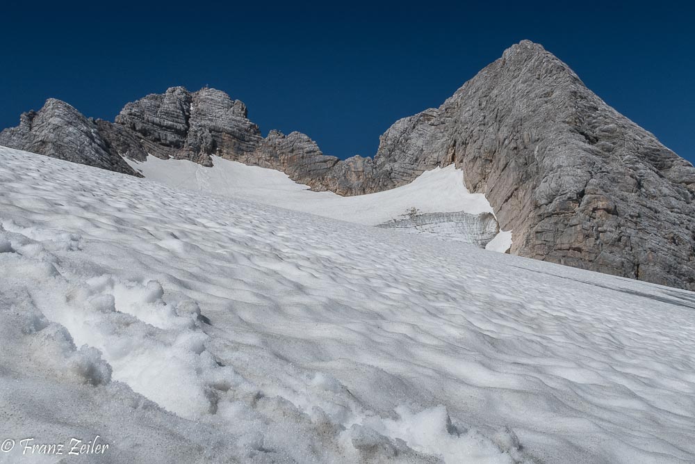 Dort wo der Weg zur Seethalerhütte abzweigt, wende ich mich nach rechts und wandere einige hundert Höhenmeter über Firn und ausgeaperte Felsen zwischen dem Hohen Kreuz im W und dem Hohen Gjaidstein im O über den zerklüfteten Hallstädter Gletscher – bzw. was davon noch übrig ist – nach N: