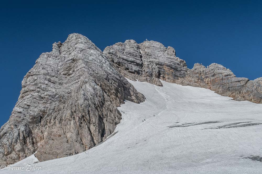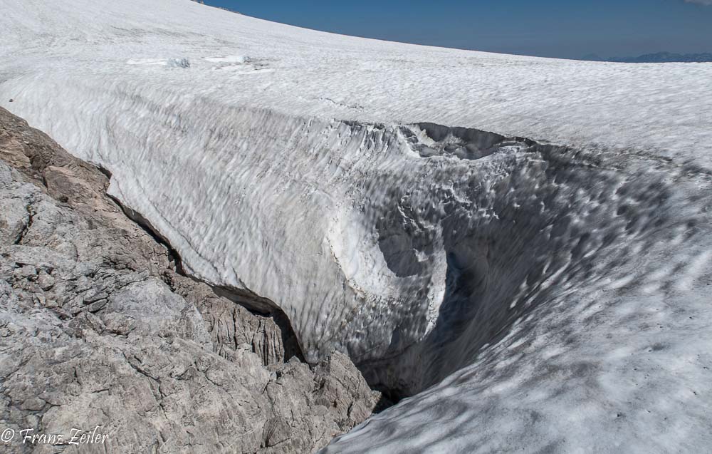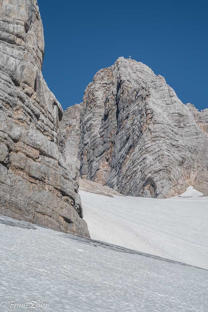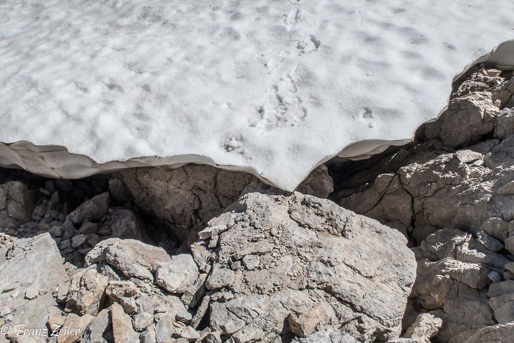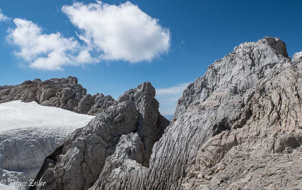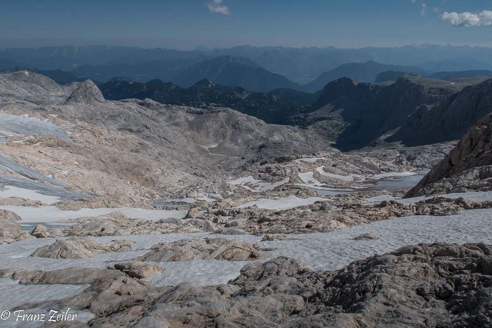Dort wo der Weg zur Seethalerhütte abzweigt, wende ich mich nach rechts und wandere einige hundert Höhenmeter über Firn und ausgeaperte Felsen zwischen dem Hohen Kreuz im W und dem Hohen Gjaidstein im O über den zerklüfteten Hallstädter Gletscher – bzw. was davon noch übrig ist – nach N: