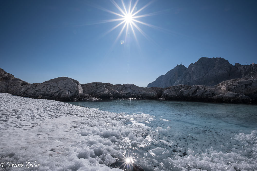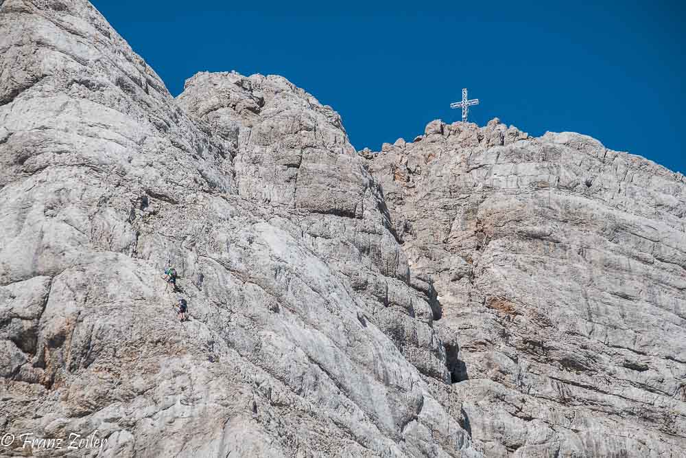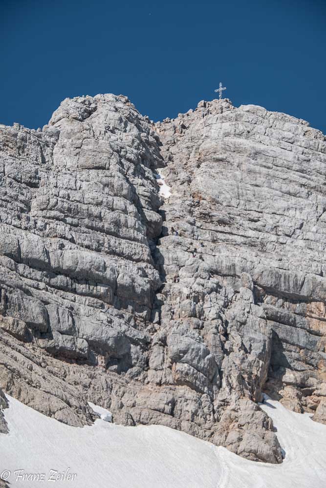 Anfangs wandere ich auf der Route zum Randkluftanstieg des Dachsteins bis auf Höhe der 2018 neu errichteten Seethalerhütte (2740m). Das weithin sichtbare Gipfelkreuz des Hohen Dachsteins spiegelt sich zeitweise im Sonnenlicht: