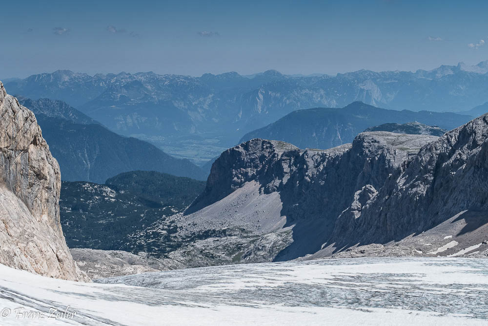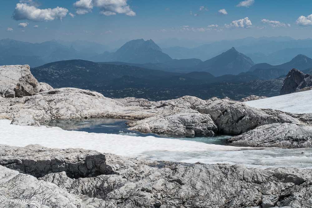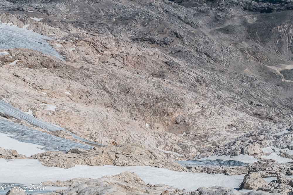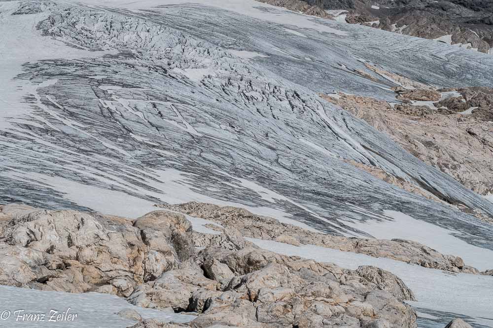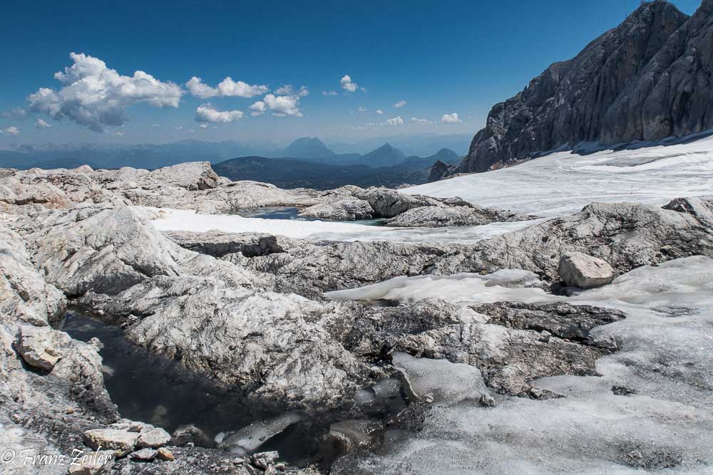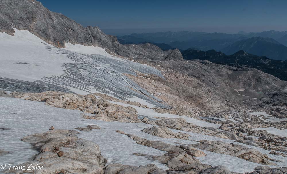 Den Zustand und die Veränderung der Pasterze habe ich in den vergangenen Jahren zweimal dokumentiert. Auch am Hallstädter Gletscher, dem größten Gletscher des Dachsteinmassivs und der gesamten nördlichen Kalkalpen, zeigt sich eindrücklich der massive Gletscherschwund als Folge des Klimawandels. Trotz seiner für Niederschläge günstigen Nordstaulage ergaben Gletschermessungen in den letzten Jahren einen durchschnittlichen Rückzug von über 30m/Jahr. Der Sommerschibetrieb am benachbarten Schladminger Gletscher musste bereits geschlossen werden.