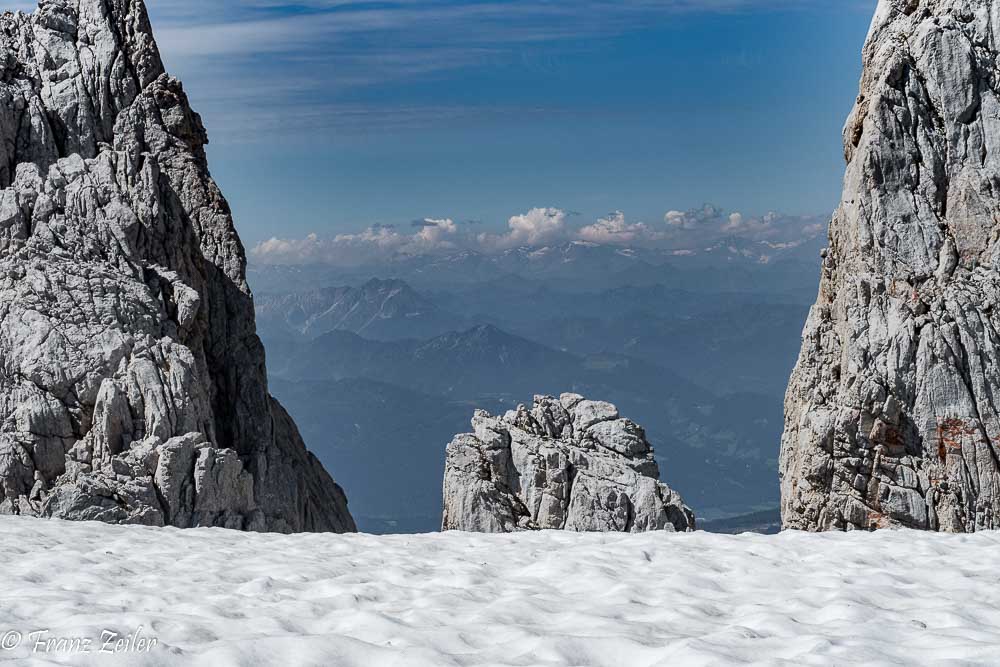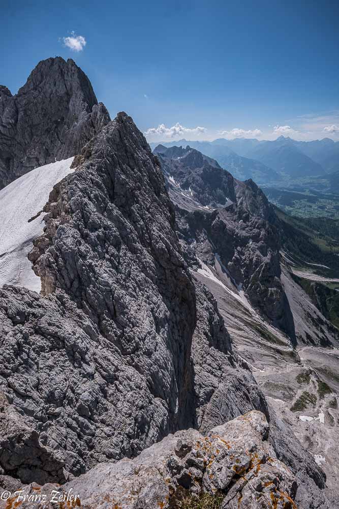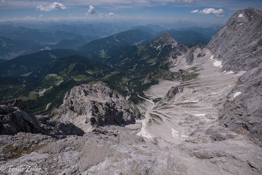 Ich genieße eine Zeitlang die Ruhe in dieser prächtigen Gebirgswelt ehe ich den Rückweg antrete. Ich wandere bis zur Randkluft zwischen den Dirndln und dem Hohen Dachstein und erhalte schwindelerregende Einblicke in die Dachstein Südwand: