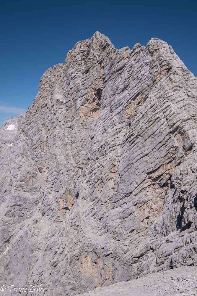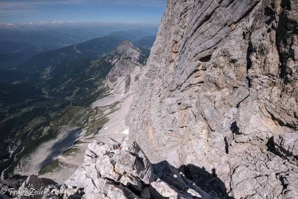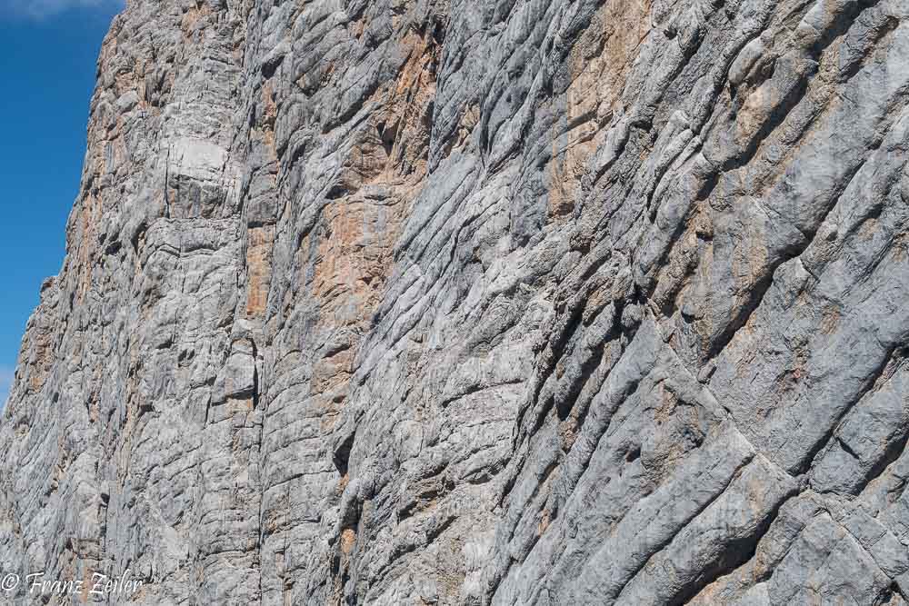 Interessant ist die nach W abfallende Schichtung des Dachsteinkalks in der Südwand: