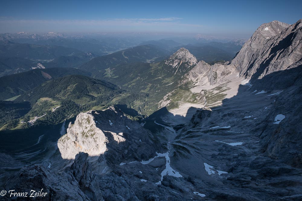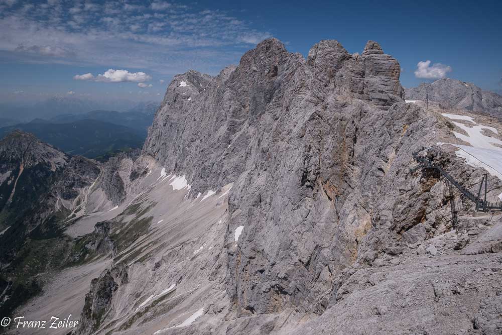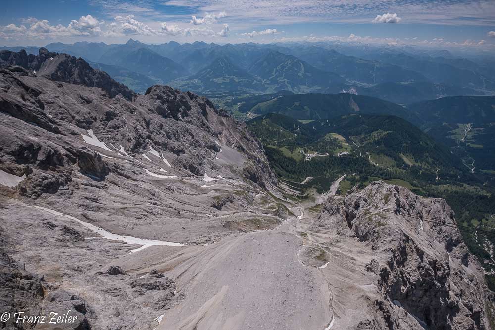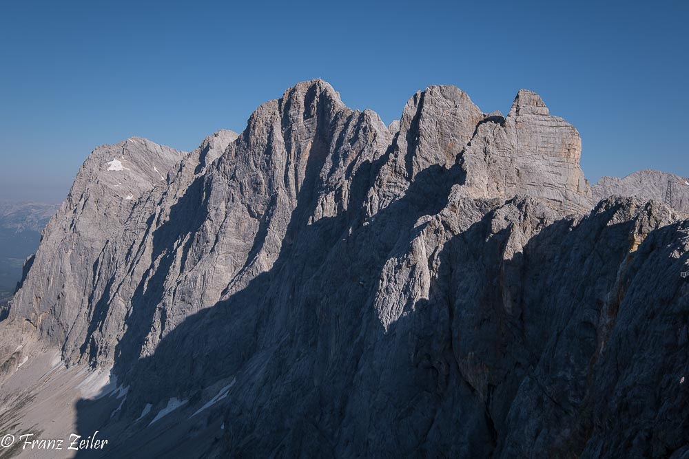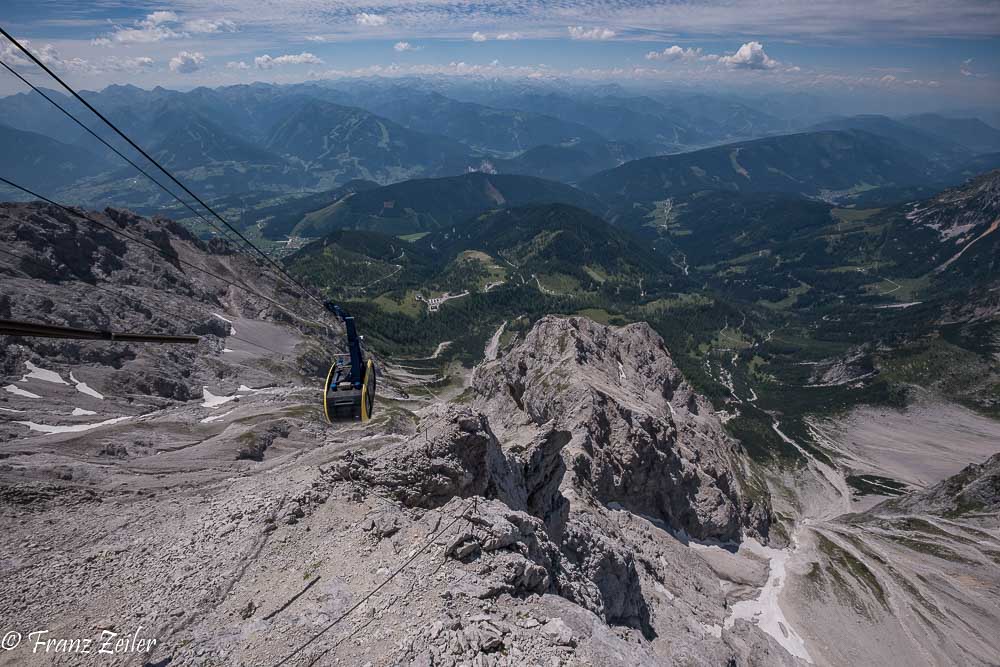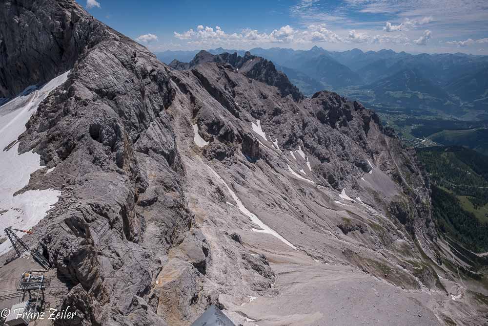 Nach der Auffahrt mit der ersten Gondel auf den Hunerkogel präsentieren sich die Südabstürze des Dachsteins vom Dachstein Sky Walk (Aussichtsplattform) z.T. noch im Schatten:
