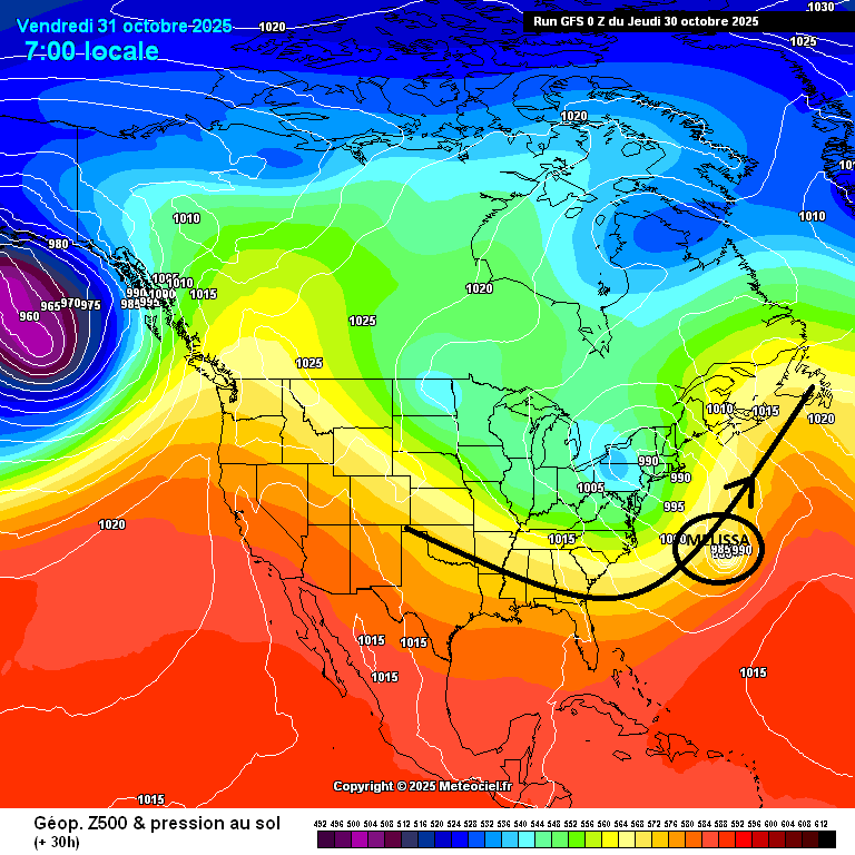 MELISSA hat in der Karibik schwere Zerstörungen angerichtet, ganze Landstriche überschwemmt und Menschenleben gefordert. Der Hurrikan zieht in den nächsten Tagen unter Abschwächung weiter nach Nordosten. Über dem offenen Atlantik wird er von einem  Trog aufgenommen und wird an dessen Vorderseite  zügig Richtung Neufundland gesteuert: