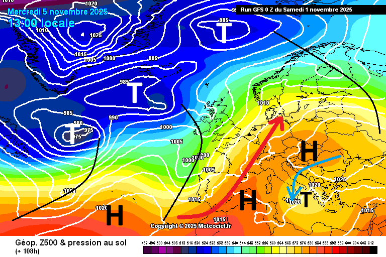 Exemplarisch eine Karte mit der simulierten Geopotential-/Druckstruktur für kommenden Mi vom aktuellen GFS-Modelllauf: