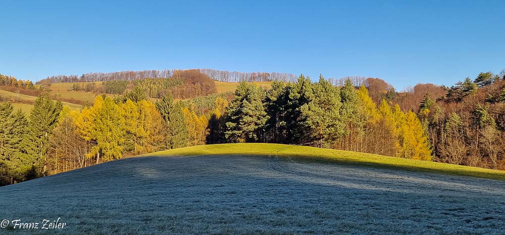Das Hochdruckwetter der letzten Tage wird unterbrochen. In trockener Luft und tagsüber auflebendem föhnigem SO-Wind verliefen die letzen Tage im Oberen Triestingtal durchwegs sonnig und ausgesprochen mild. Die letzten verfärbten Blätter des Laubwaldes wurden im Wochenverlauf vom föhnigen SO-Wind von den Bäumen geholt: