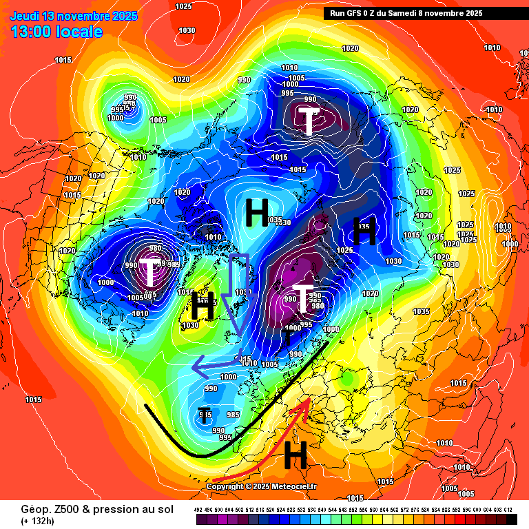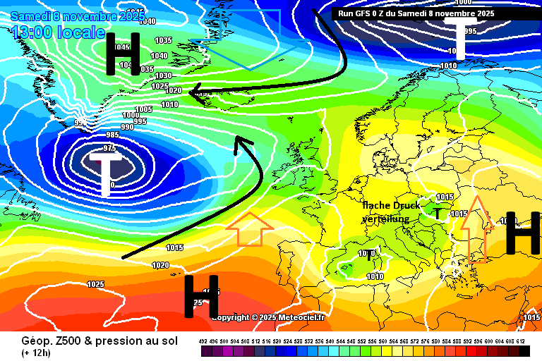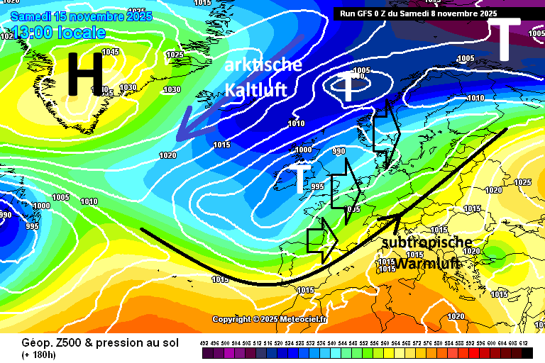 Die ausgeprägte Hochdruckanomalie über Grönland wird als sehr persistent simuliert.  Der NA-Trog mit positiver Achsneigung an seiner SO-Flanke wird laufend regeneriert und stationär. Während Island einen heftigen Wintereinbruch zu verzeichnen hat, verbleiben die Ostalpen an der milden Vorderseite des Troges: