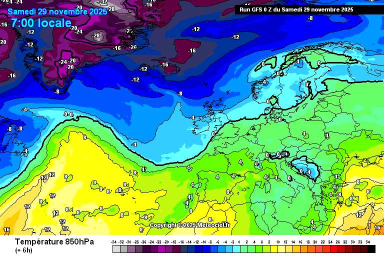 Die zweite Animation zeigt die zeitgleichen milden Temperaturen in ca. 1500m. Allfällige Kaltluftseen in der Grundschicht unter einer Inversion sind natürlich nicht zu erkennen: