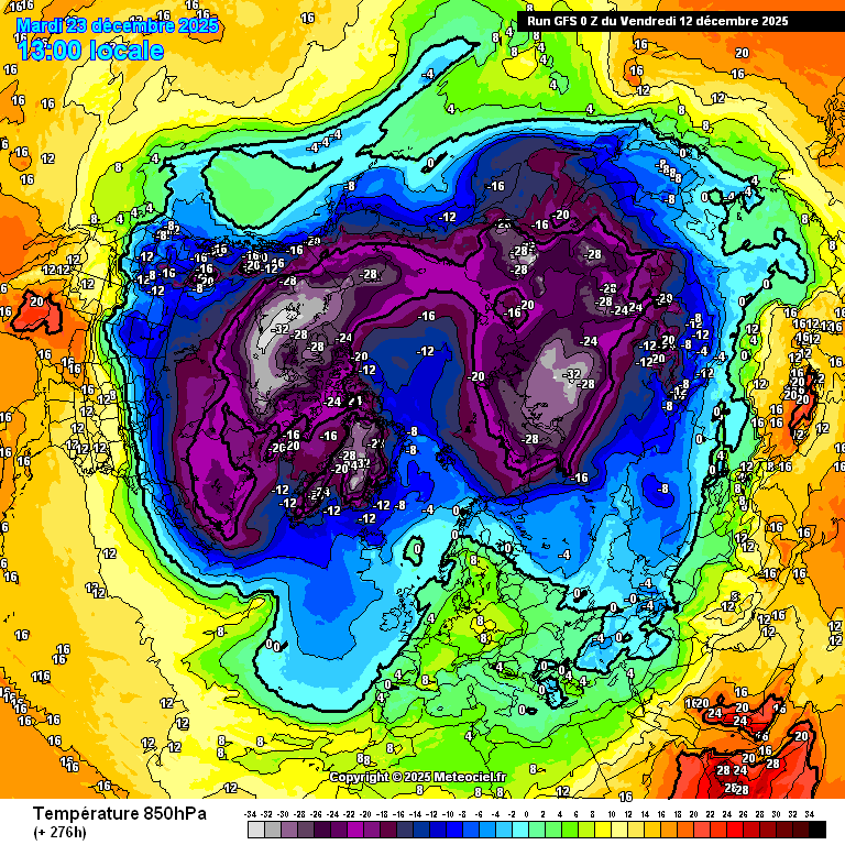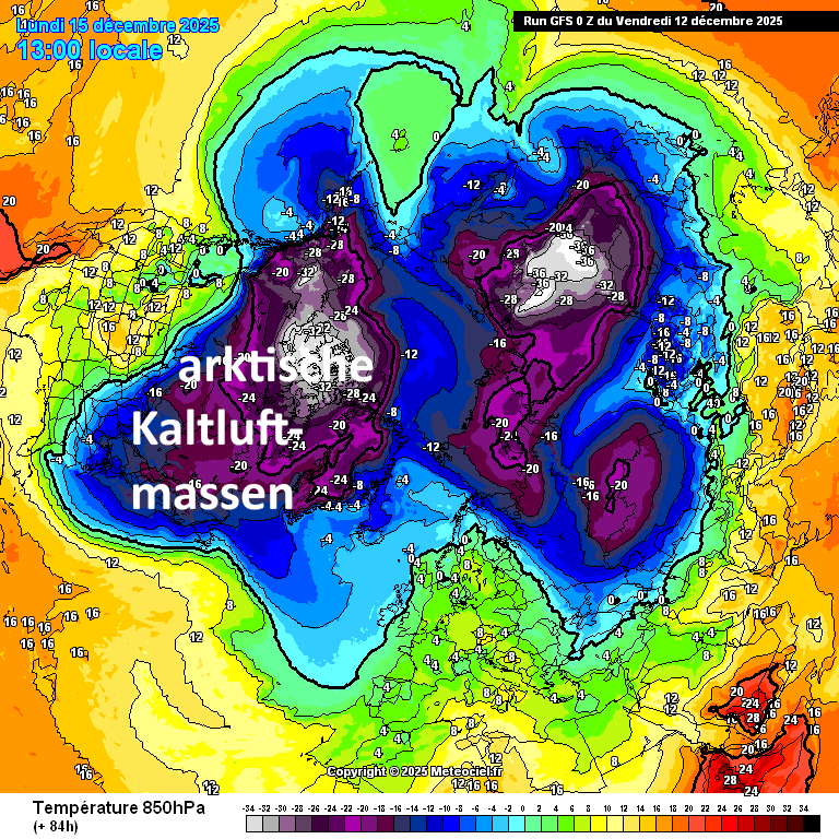 Die nachfolgenden exemplarischen Karten mit der 500hPa-Geopotential-/Druckstruktur bzw. 850hPa-Temperaturen vom aktuellen GFS-Modelllauf für Anfang kommender Woche und die beginnenden Weihnachtstage zeigen das eingefahrene Zirkulationsmuster mit dem steuernden PW-Fragment über Nordkanada, dem winterlichen Nordamerika und frühlingshaften Alpenraum: