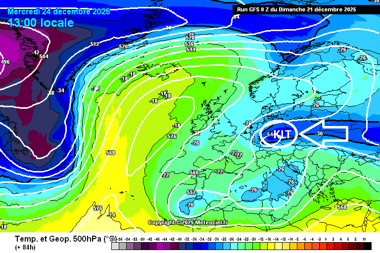 Mit dieser erreicht Kontinentalluft den Ostalpenraum und trifft hier auf feuchtmilde Mittelmeerluft. Grundsätzlich hat diese Mischung im Winter hohes Potential für Neuschnee.  Da die advehierte Luftmasse aber  mangels Schnee und vorhandener Kaltluft über OE und Russland nur mäßig kalt ist, wird sich die  Ausbildung einer Schneedecke bis ins Flachland nicht ausgehen. Die NS-Mengen bleiben eher gering. Mit etwas Glück könnte sich exakt am Hl. Abend mit der Passage eines KLT`s (Kaltlufttropfen), der mit der östl. Grundströmung nördl. der Ostalpen nach W zieht,  Schneeflocken bis ins Flachland verirren. In höheren Lagen des Waldviertels und am Alpenostrand sind einige cm Neuschnee zu erwarten; deutlich weniger weiter im W.
