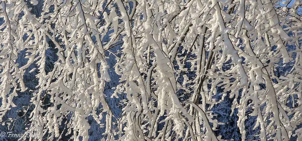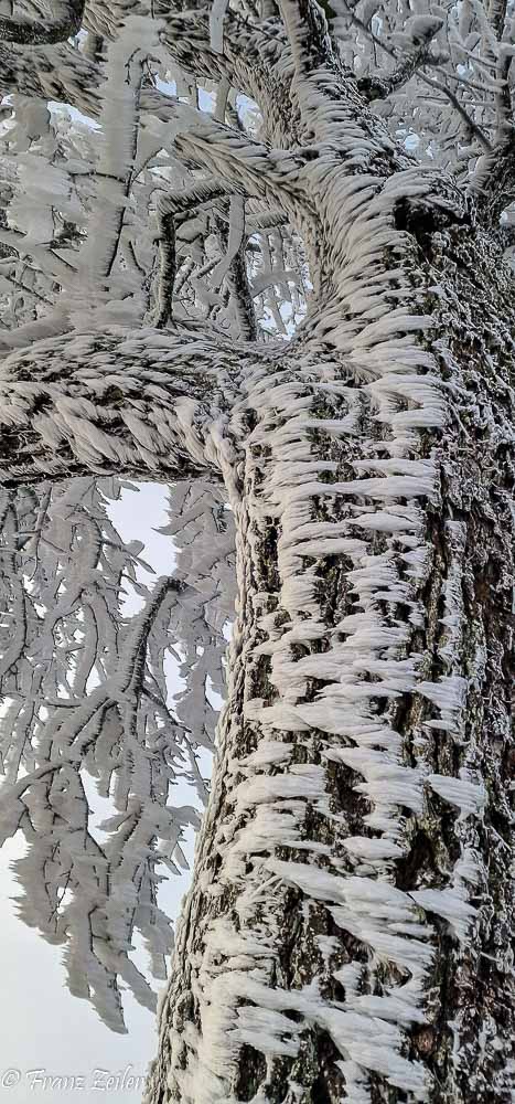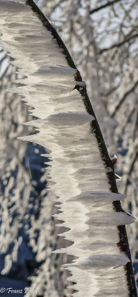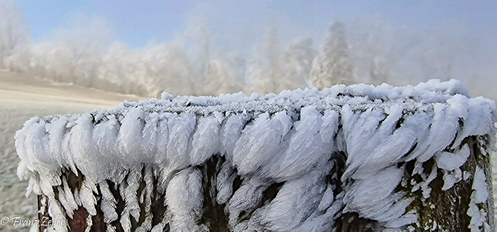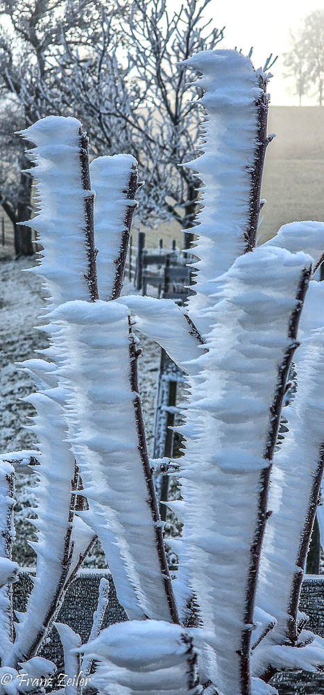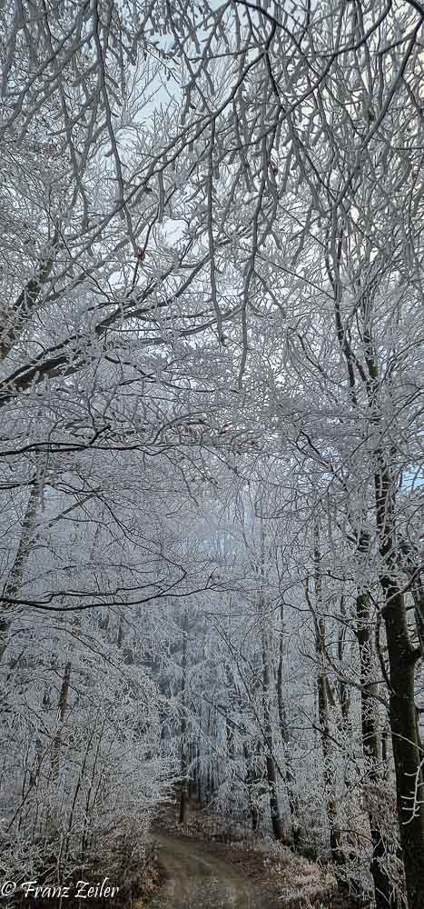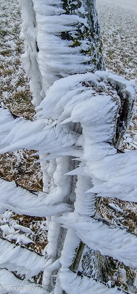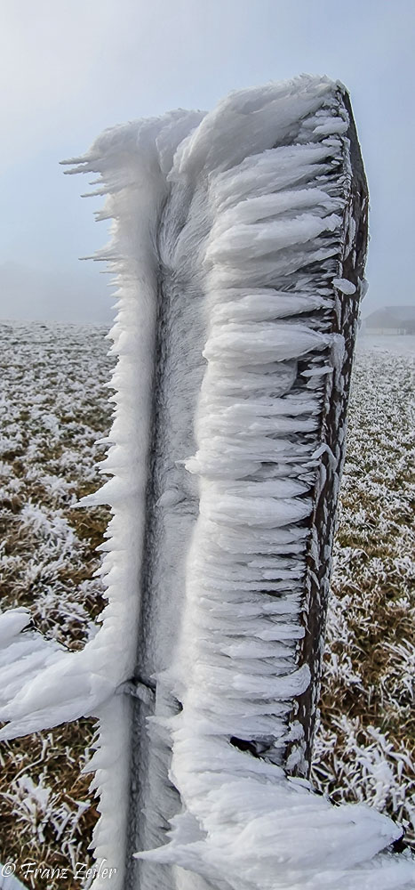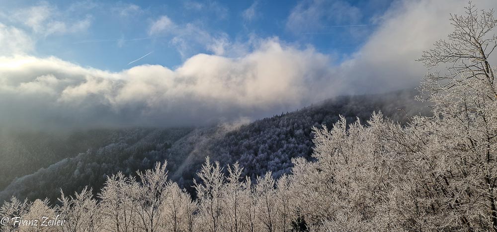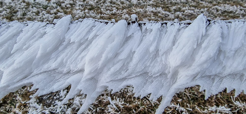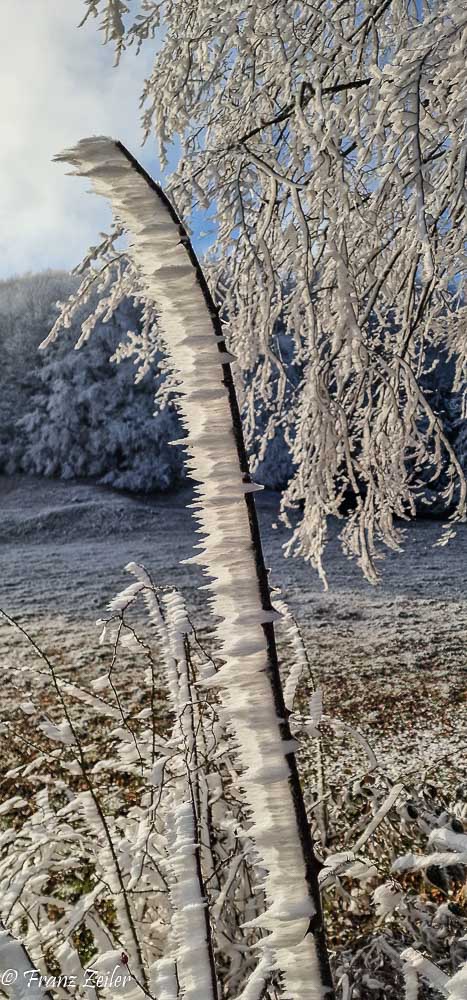 Starker föhniger, in der Grundschicht kalter, SO-Wind produzierte im Oberen Triestingtal oberhalb knapp 700m bizarre Raueisstrukturen an der Vegetation und Weidezäunen. Nebel bzw. ein Wechsel von Wolken und Sonne begleiteten mich bei meiner kurzen Wanderung vom Gerichtsberges, dem Übergang vom Triestingtal ins Gölsental, auf die Araburg.