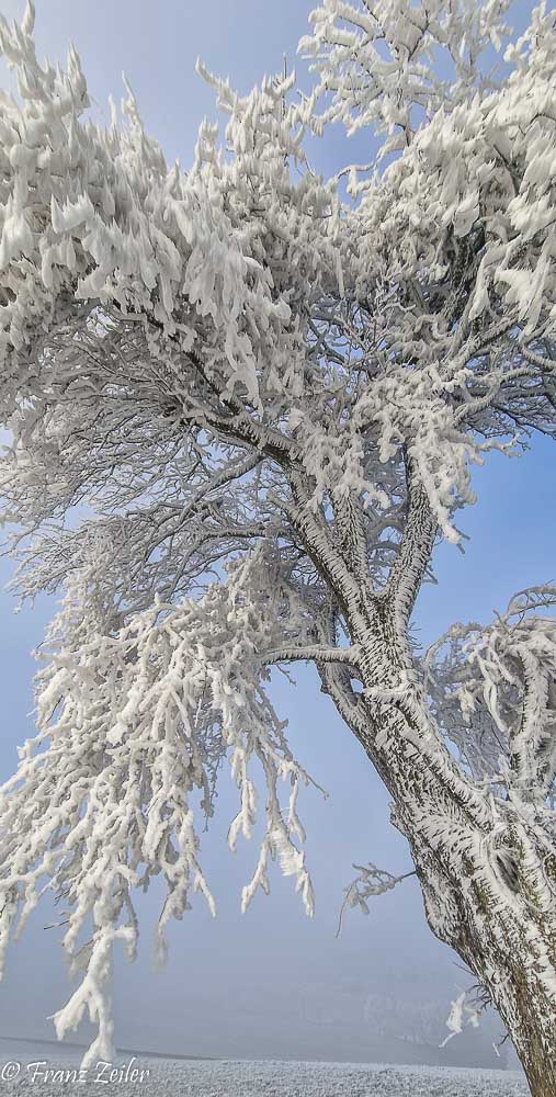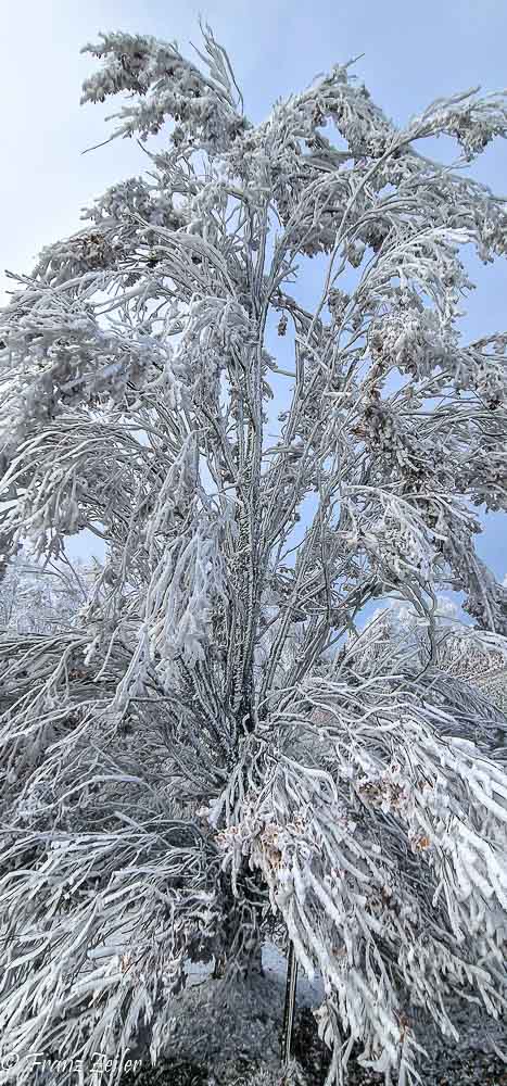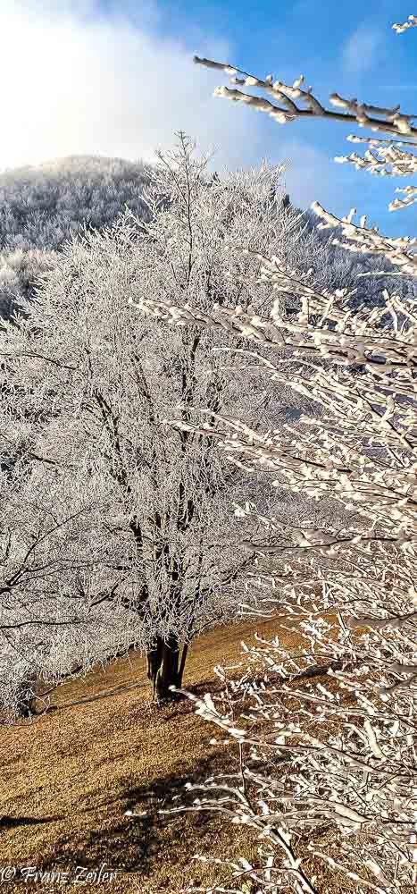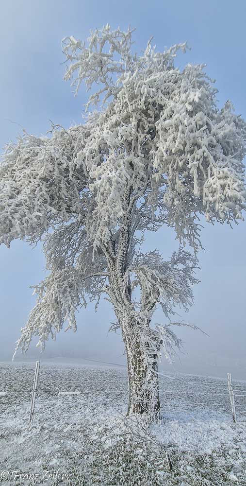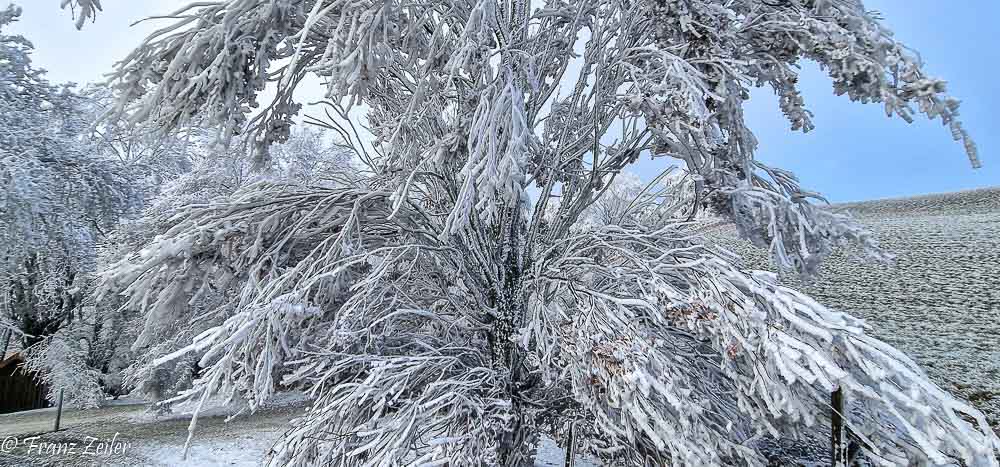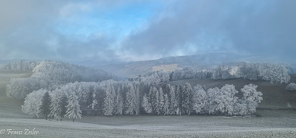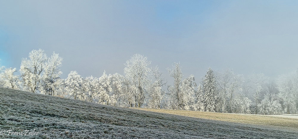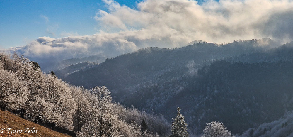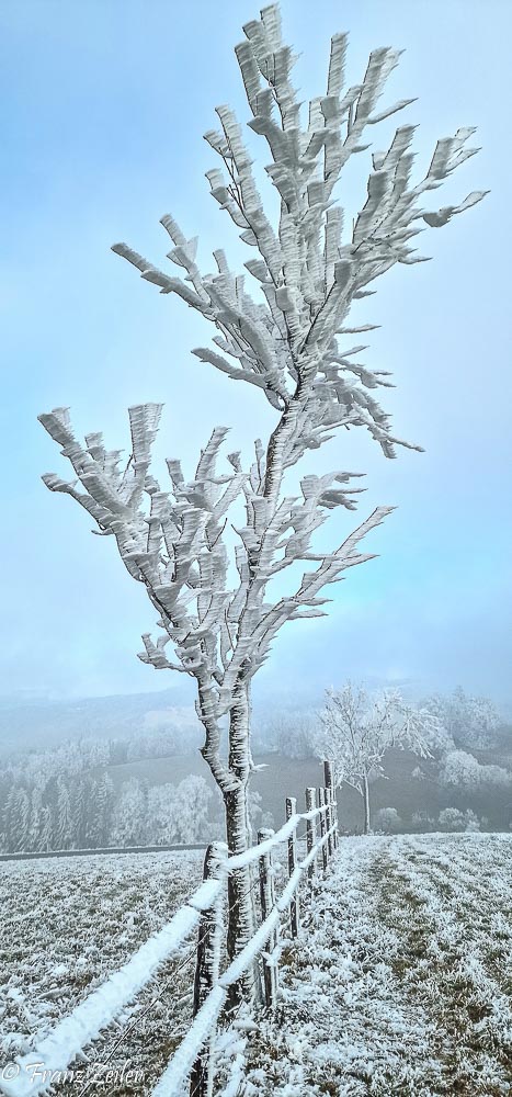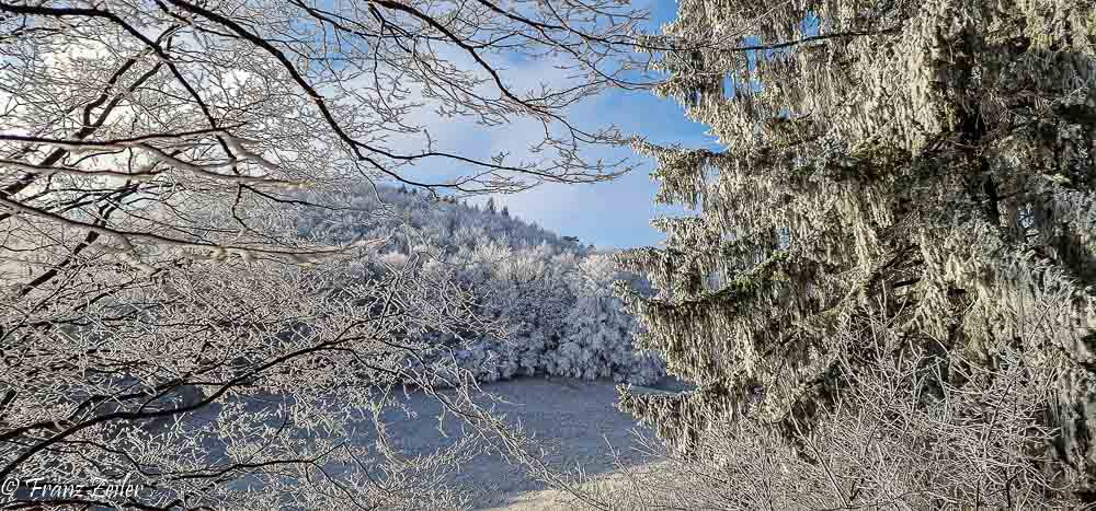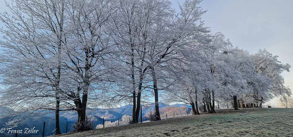 Starker föhniger, in der Grundschicht kalter, SO-Wind produzierte im Oberen Triestingtal oberhalb knapp 700m bizarre Raueisstrukturen an der Vegetation und Weidezäunen. Nebel bzw. ein Wechsel von Wolken und Sonne begleiteten mich bei meiner kurzen Wanderung vom Gerichtsberges, dem Übergang vom Triestingtal ins Gölsental, auf die Araburg.