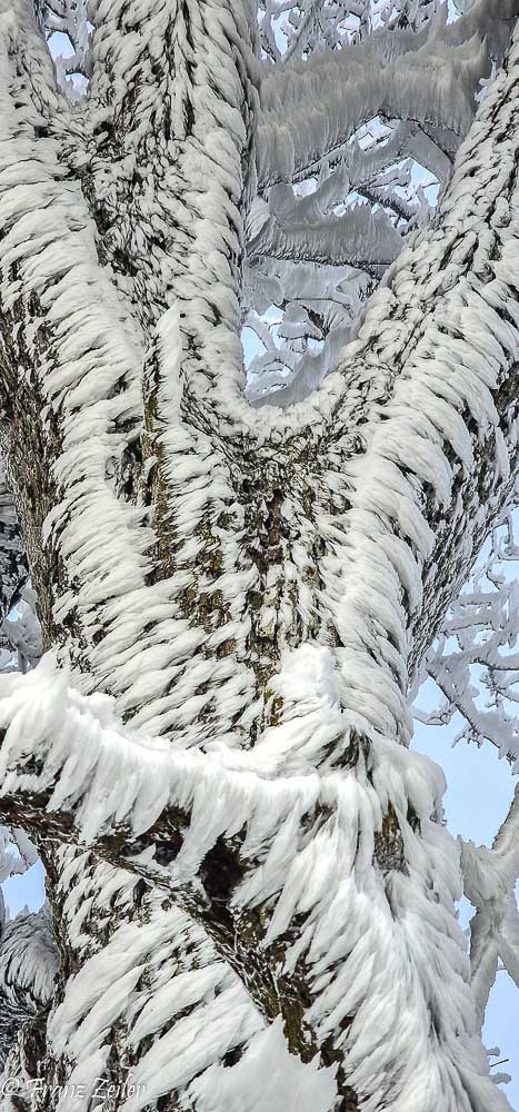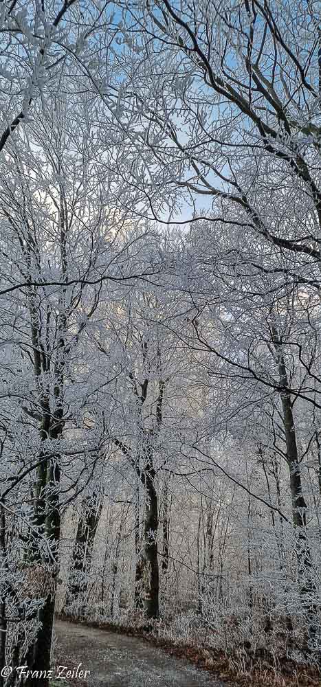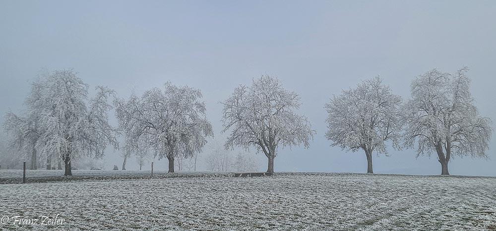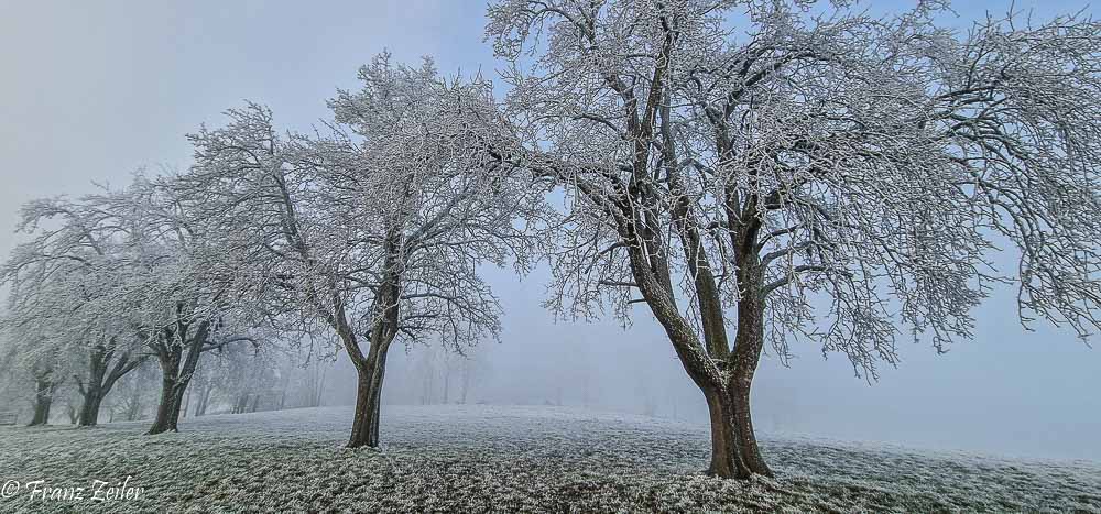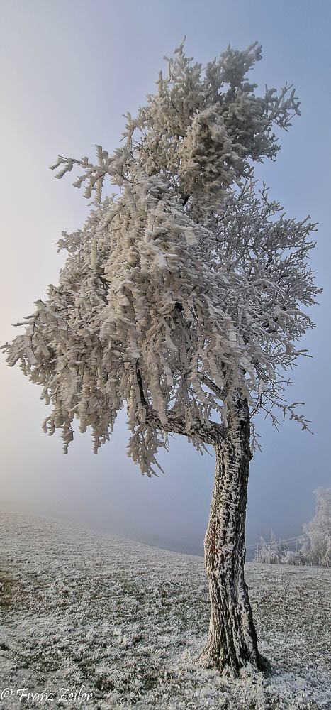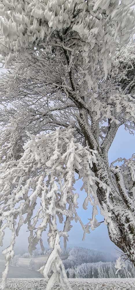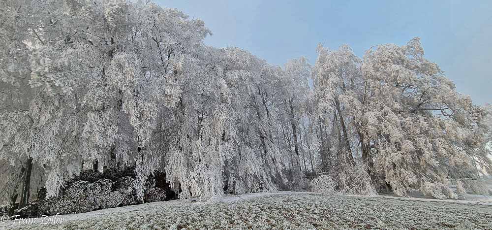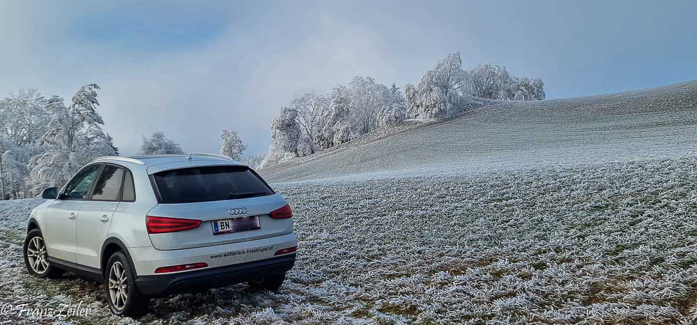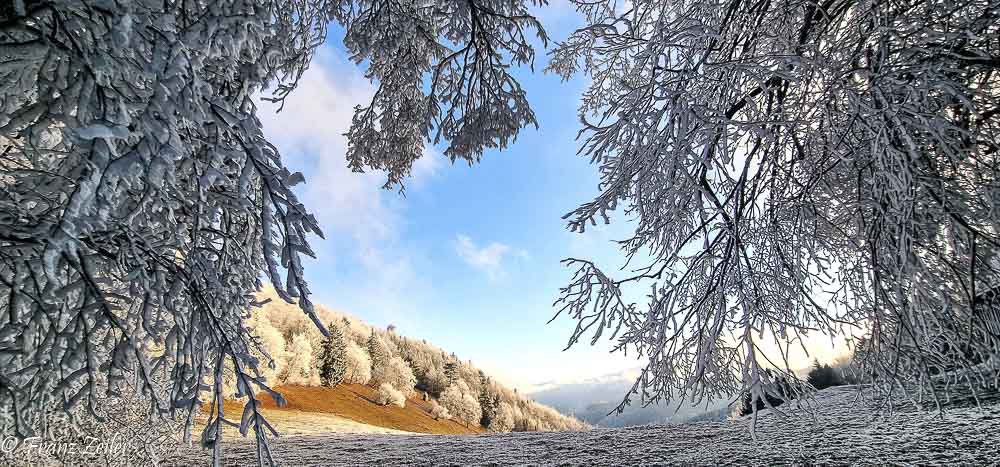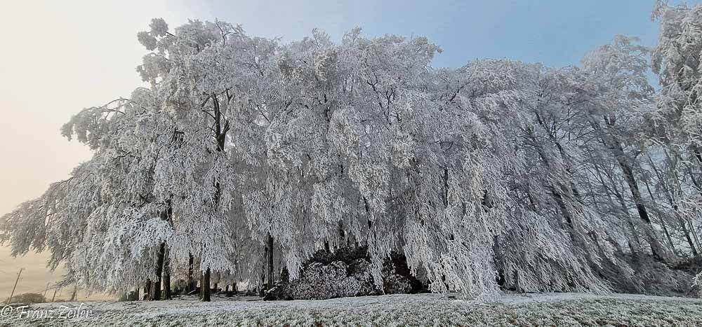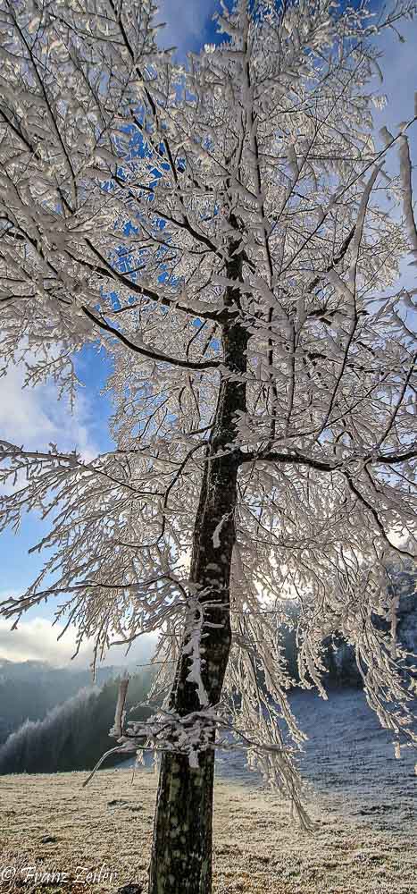 Starker föhniger, in der Grundschicht kalter, SO-Wind produzierte im Oberen Triestingtal oberhalb knapp 700m bizarre Raueisstrukturen an der Vegetation und Weidezäunen. Nebel bzw. ein Wechsel von Wolken und Sonne begleiteten mich bei meiner kurzen Wanderung vom Gerichtsberges, dem Übergang vom Triestingtal ins Gölsental, auf die Araburg.