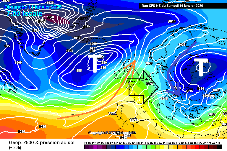 Exemplarisch Karten mit der für kommenden Do und Sa simulierten Geopotential-/Druckstruktur vom aktuellen GFS-Modelllauf: