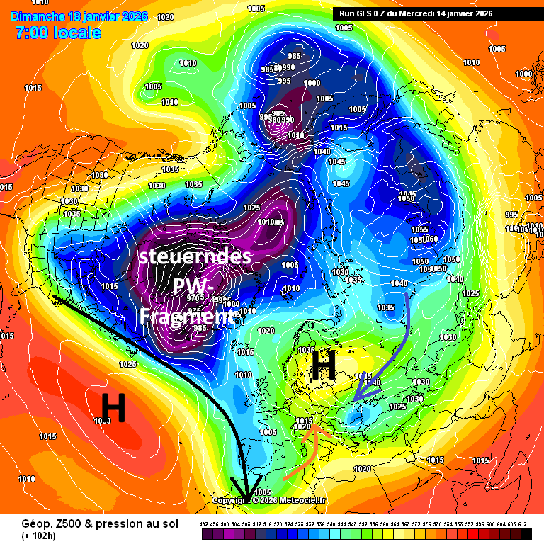 In obiger Karte ist gut zu erkennen, dass sich das blockierend e Kontinentalhoch mit seinem Kern retrograd zum Baltikum verlagert. Dabei ändert sich das großräumige Zirkulationsmuster. Die Störung des sPW (stratosphärischer Polarwirbel), auf den ich in einem der letzten Analysebeiträge hingewiesen habe, und ein reflektives „downwelling“ zeigen Wirkung auf die Troposphäre, unsere Wetterküche. Kontinentale Kaltluft aus sibirischen Gebieten wird angezapft und nach W in Bewegung gesetzt. Atlantische Tiefdruckgebiete tropfen nach S ab.
