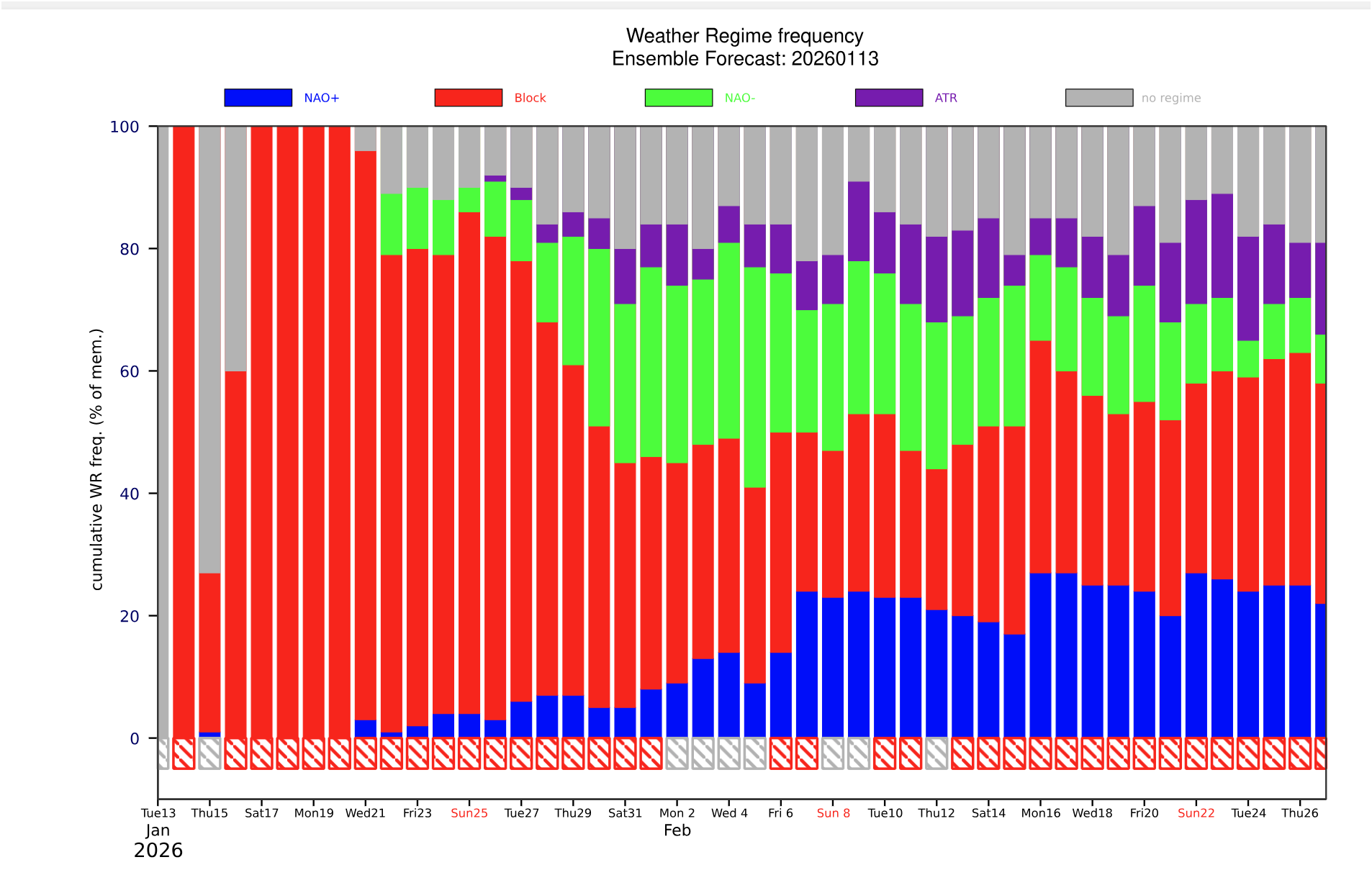 Die prognostizierten Wetterregime des europäischen Wetterzentrums dokumentieren die fast bis Ende des Monats andauernde Blockadelage (rote Balken):
