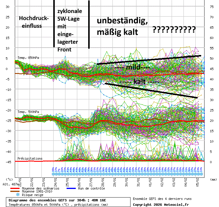 Der derzeitige Hochdruckeinfluss mit der Zufuhr kalter Kontinentalluft im O und milden Temperaturen im W dauert noch bis Fr an. Die Folgewetterlage (GWL Ws) bringt ausgeglichene und mäßig kalte Temperaturen, aber voraussichtlich nur nennenswerten Neuschnee in höheren Lagen der Westhälfte (V, T, Slzbg, Oberkärnten).