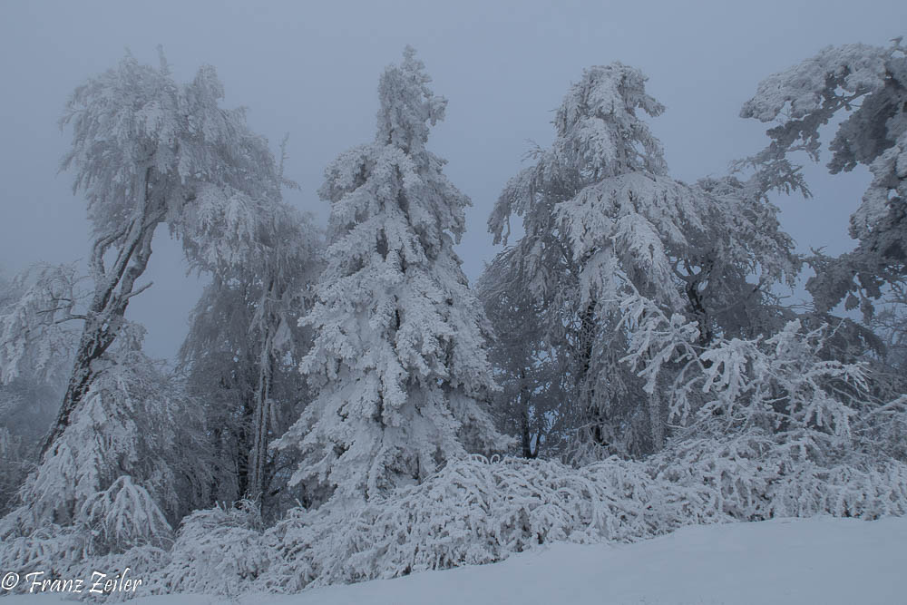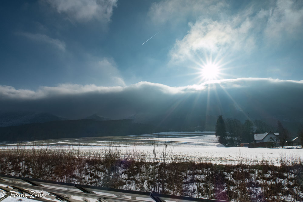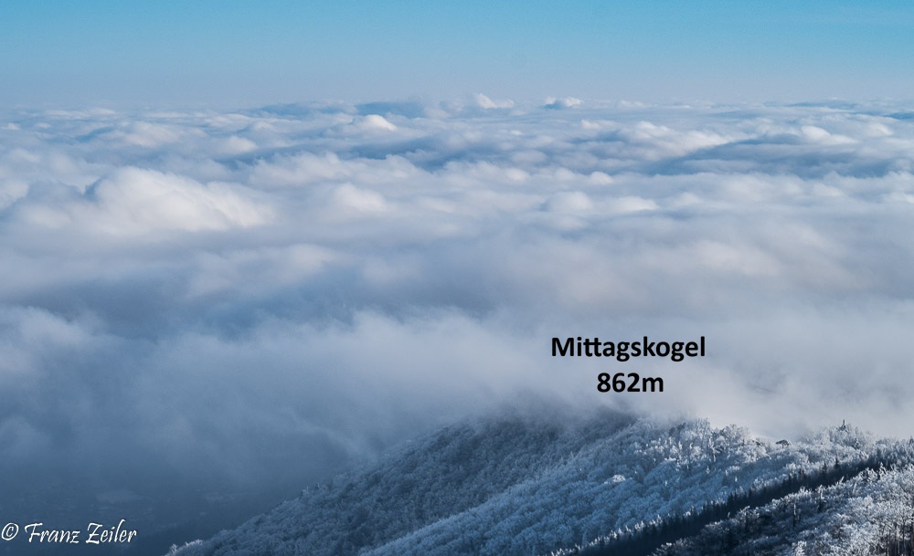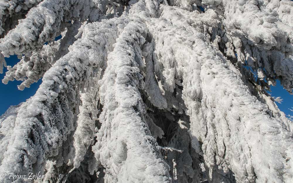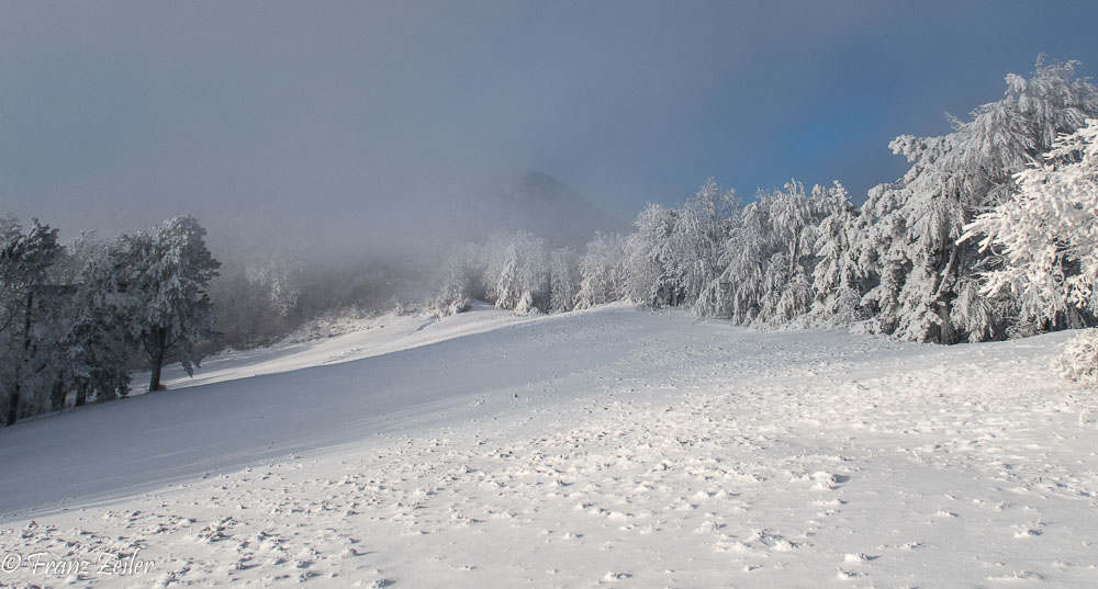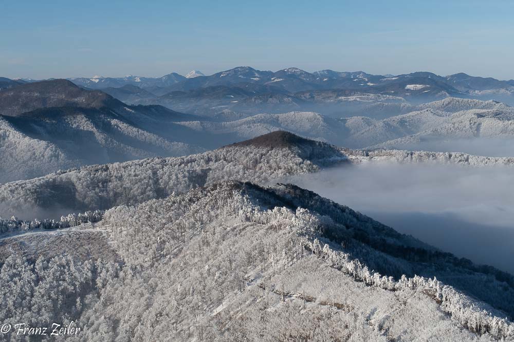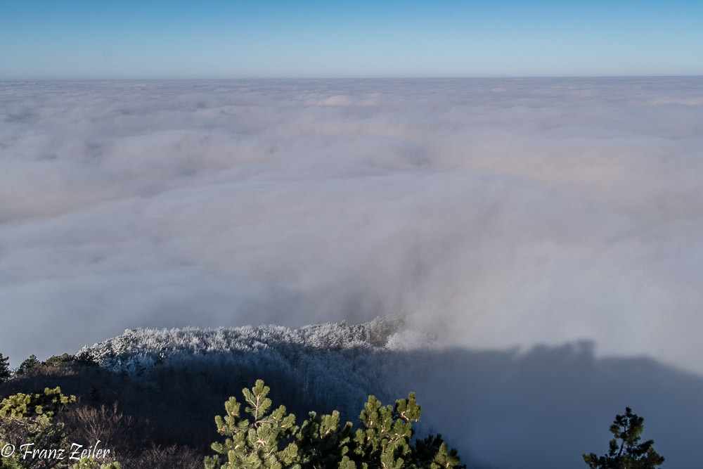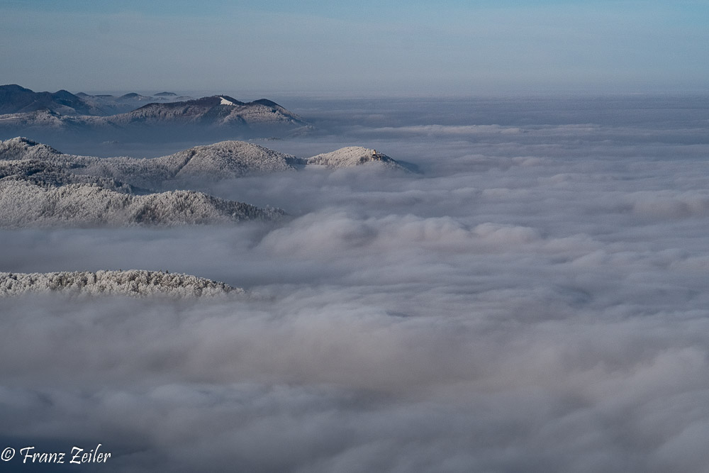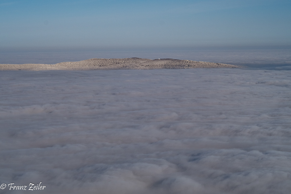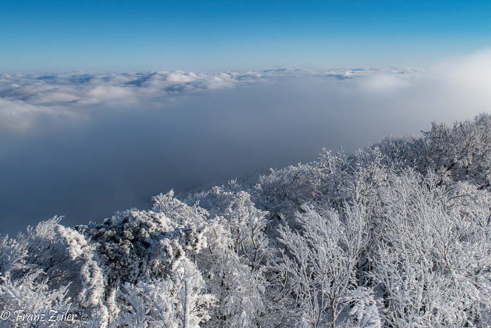 Wie in einer Endloseschleife wiederholte sich in den letzten Tagen (Mo – Fr) das Wetter. Zum Dauerfrost gesellte sich Nebel mit einer Obergrenze um 900m, in Höhenlagen von 700m-900m prächtiges winterliches Raueis, darüber war es sonnig bei bester Fernsicht und spürbar milder.