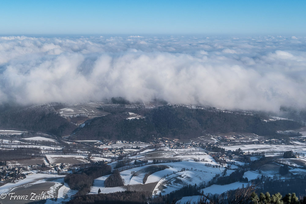 Ein spannendes Erlebnis ist bei derartigen Inversionslagen jedesmal die Wegstrecke vom 862m hohen Mittagskogel über den Hocheckkamm auf den 1037m hohen Hocheckgipfel. Die Ungewissheit darüber, „Ob“ und „Wo“ ich vom Nebel in die Sonne gelange ist jedesmal groß: