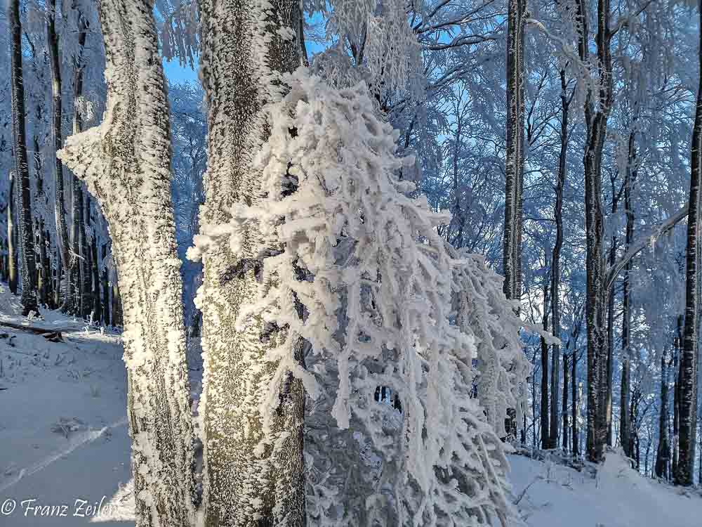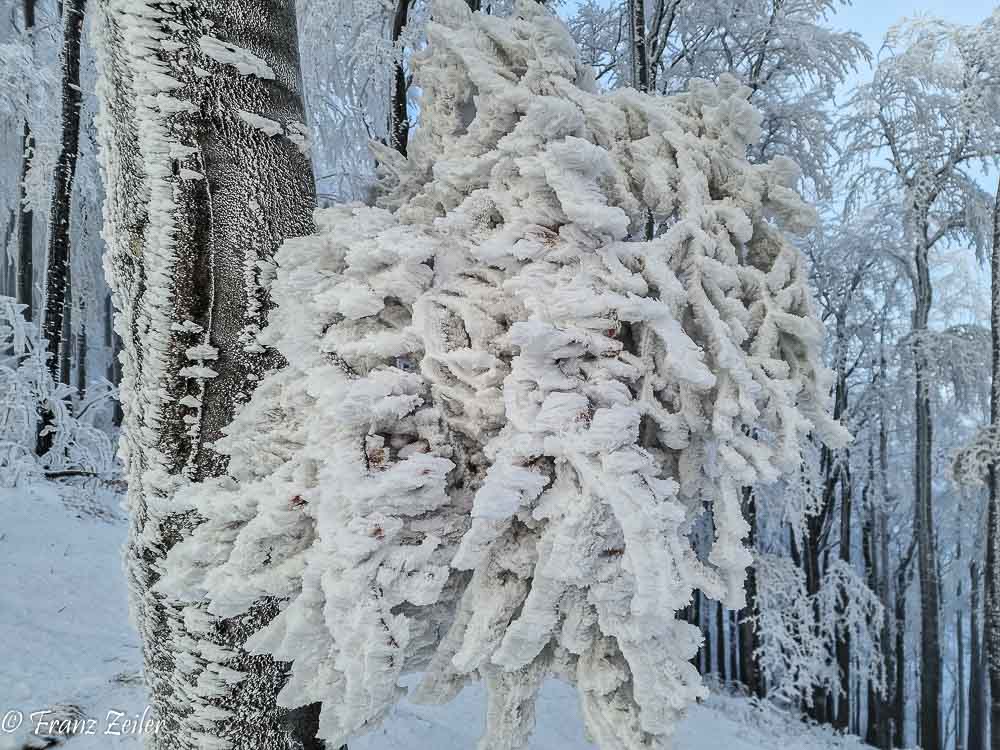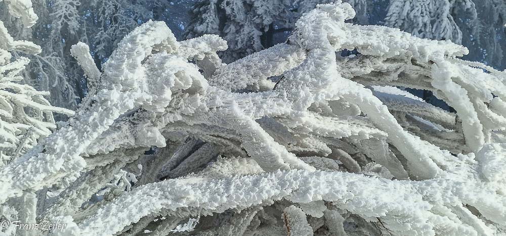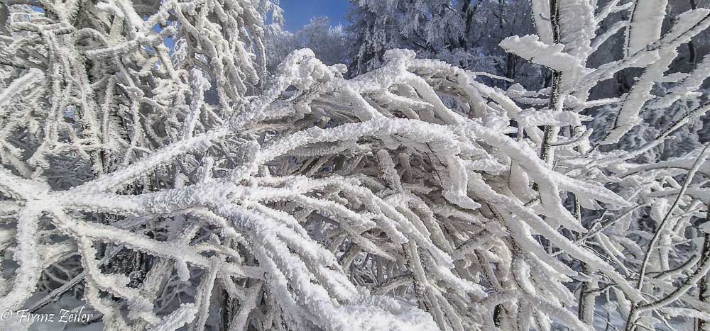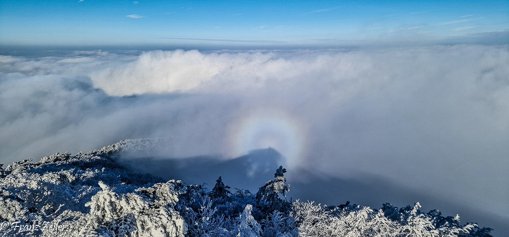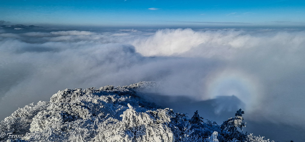 Der heurige Winter geizt zwar mit Schnee, entschädigt dafür aber mit reizvollen Nebelfrost-/Raueislagen. Auch am gestrigen „Murmeltiertag“ präsentierte das Hocheck zum wiederholten Male in diesem Winter sein faszinierendes Raueiskleid im ungetrübten Sonnenschein und projizierte als Draufgabe eine Glorie um den Schatten der Hocheckwarte auf der Nebeloberfläche.