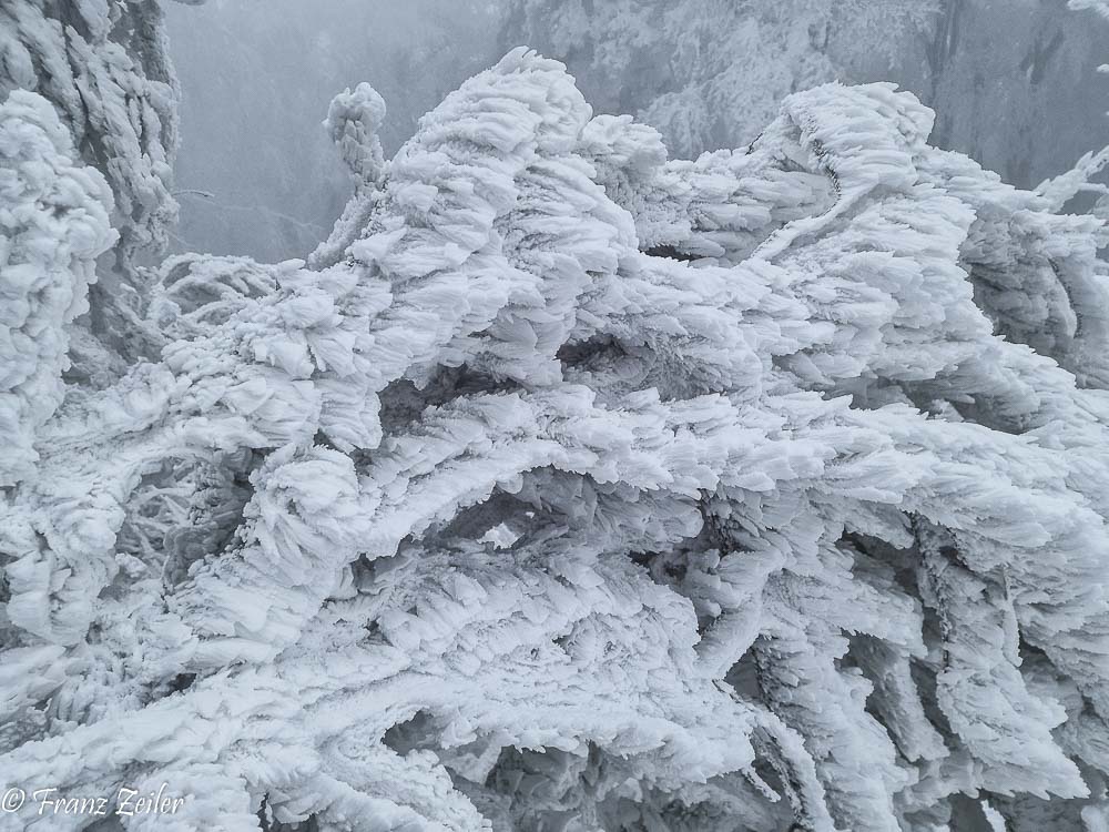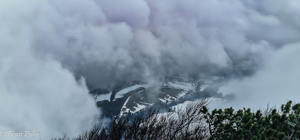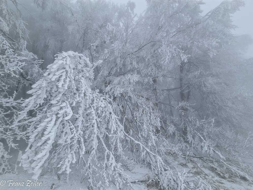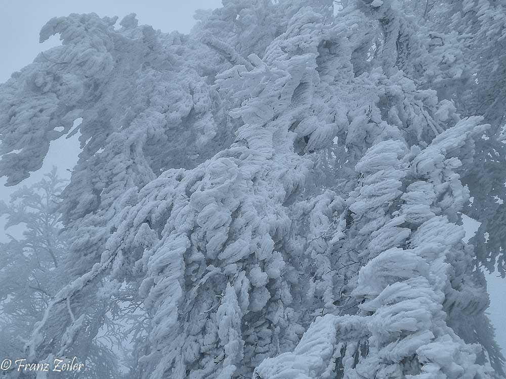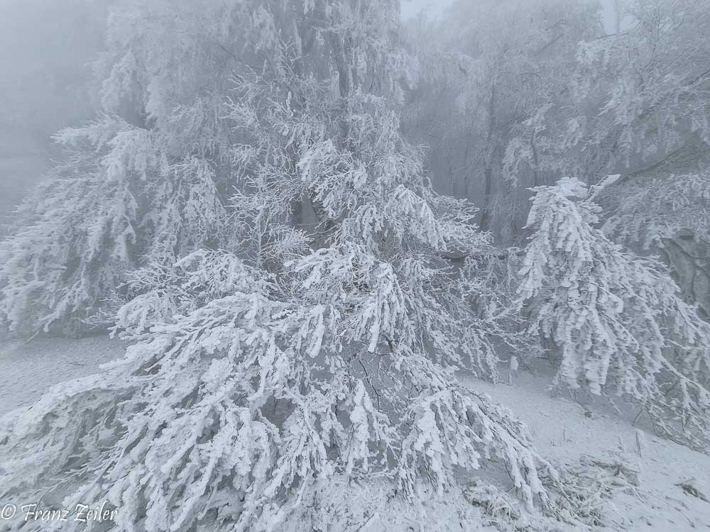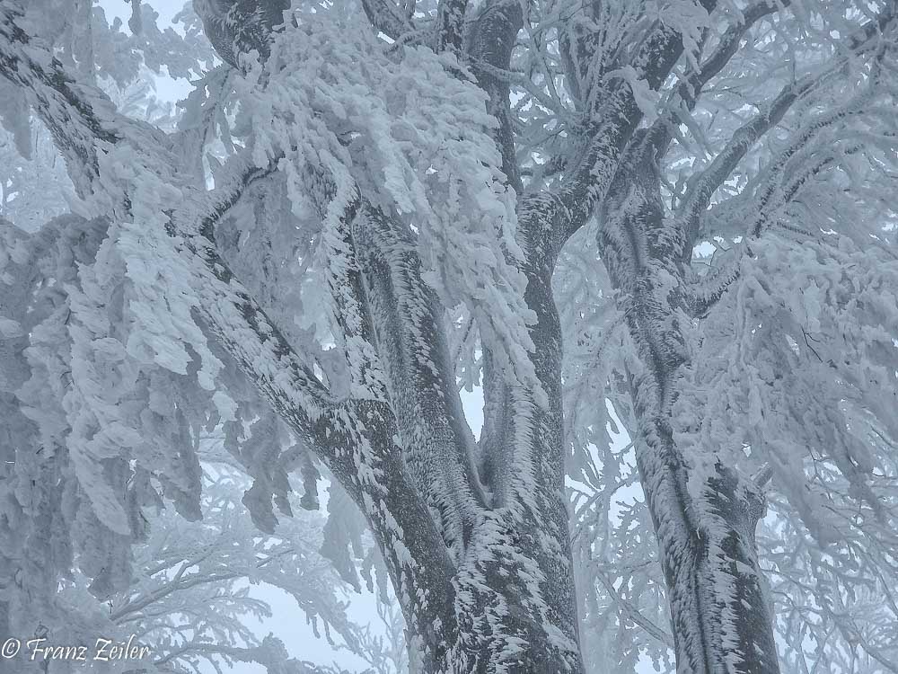 Die Südföhnlage der letzten Tage bewirkte in den Südstaulagen – insbesondere Karnische Alpen und Dolomiten – große Neuschneemengen. Trocken, oft sonnig und mild blieb es dagegen an der föhnigen Alpennordseite zwischen Vorarlberg und Salzburg. Nebelig trüb  verliefen die Tage im nördl. Alpenvorland und dem östl. Flach- und Hügelland. Auch die Gipfel des Oberen Triestingtales waren bei lebhaftem SO-Wind und anfangs negativen Temperaturen in dichten Nebel gehüllt. Dabei baute sich eine prekäre Raueislage auf. Temperaturanstieg und Tauwetter bis in die Gipfelregionen verhinderte zum Glück größere Bruchschäden durch die Eislasten. Unter den mächtigen Buchen des oberen Hocheckkammes liegt nun auf den Waldböden das von den Ästen gefallene Raueis geschätzt bis zu 1m hoch: