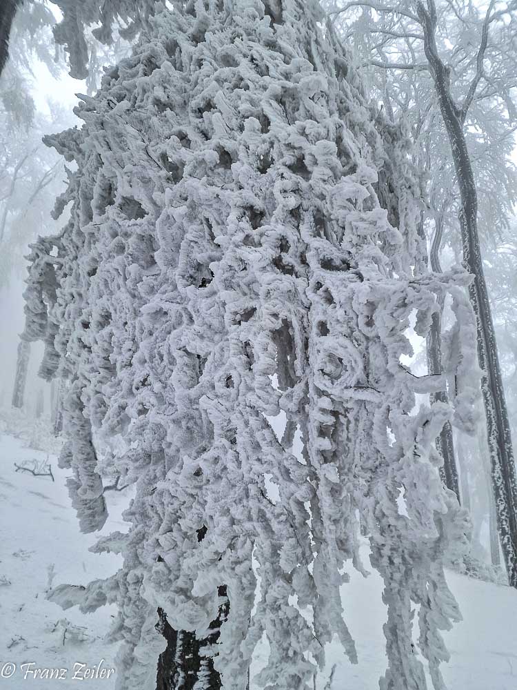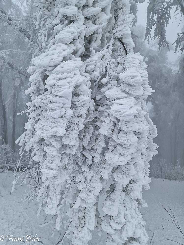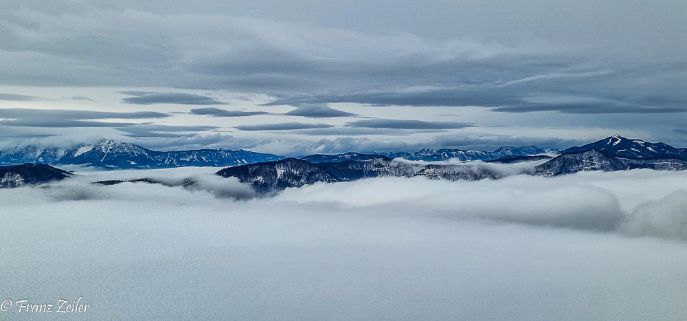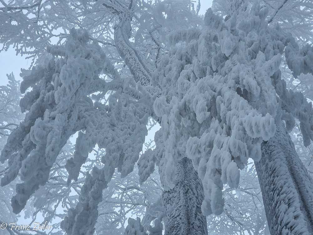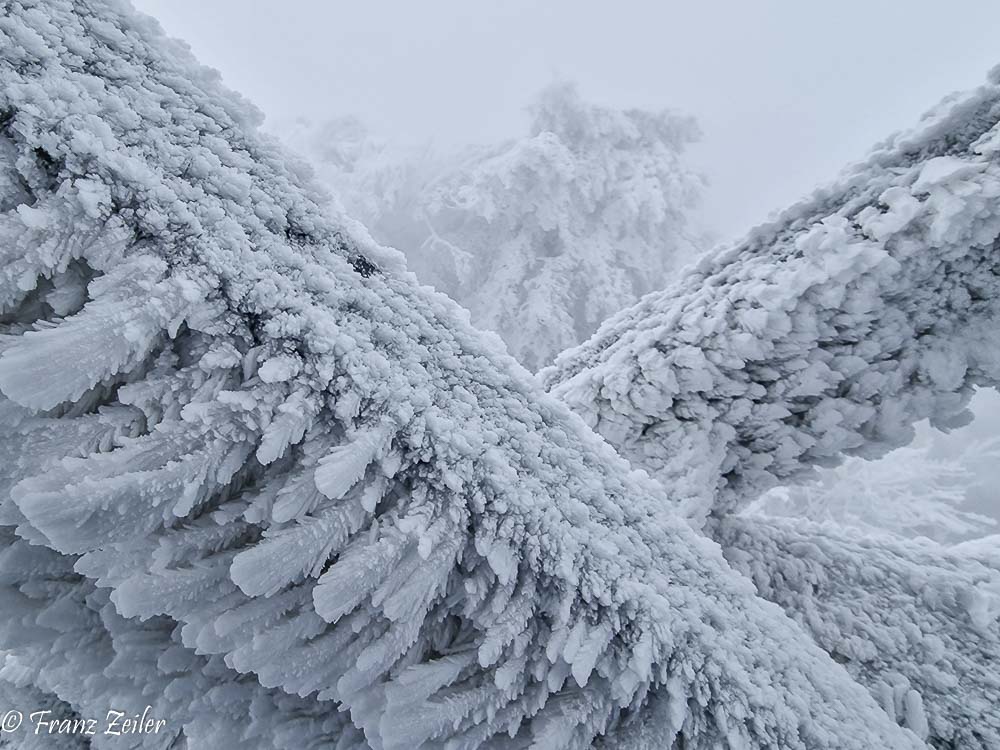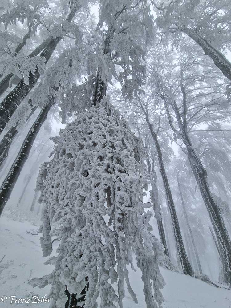 Die Südföhnlage der letzten Tage bewirkte in den Südstaulagen – insbesondere Karnische Alpen und Dolomiten – große Neuschneemengen. Trocken, oft sonnig und mild blieb es dagegen an der föhnigen Alpennordseite zwischen Vorarlberg und Salzburg. Nebelig trüb  verliefen die Tage im nördl. Alpenvorland und dem östl. Flach- und Hügelland. Auch die Gipfel des Oberen Triestingtales waren bei lebhaftem SO-Wind und anfangs negativen Temperaturen in dichten Nebel gehüllt. Dabei baute sich eine prekäre Raueislage auf. Temperaturanstieg und Tauwetter bis in die Gipfelregionen verhinderte zum Glück größere Bruchschäden durch die Eislasten. Unter den mächtigen Buchen des oberen Hocheckkammes liegt nun auf den Waldböden das von den Ästen gefallene Raueis geschätzt bis zu 1m hoch: