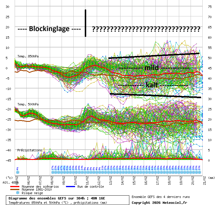 Tendenziell dürften in der zweiten Februardekade atlantische Fronten zunehmend den Ostalpenraum beeinflussen und auch in den NS-armen Gebieten nördl. der Alpen in höheren Lagen für Neuschnee sorgen. Die arktischen Luftmassen kommen in Wochenfrist bis Skandinavien voran.