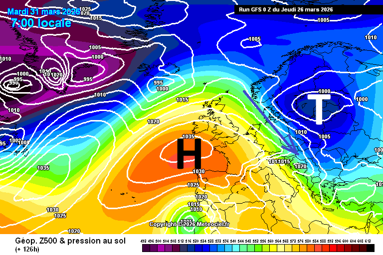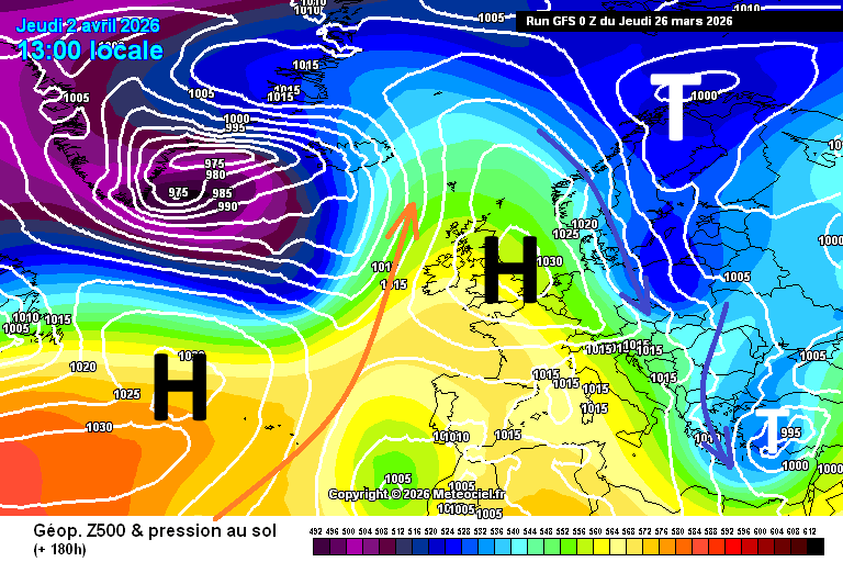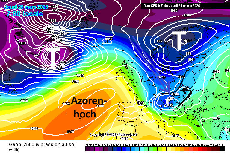 Exemplarisch die simulierte Druck- und Geopotentialstruktur des aktuellen GFS-Modelllaufes für Di und Do in der Karwoche: